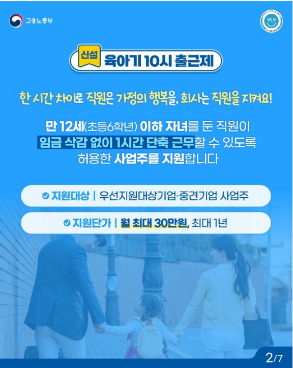초등학교 저학년 자녀를 둔 직원이 오전 10시에 출근할 수 있도록 배려하는 제도입니다. 정부는 이를 시행하는 중소기업 사업주에게 월 30만 원을 지원하여 자발적인 참여를 독려합니다.