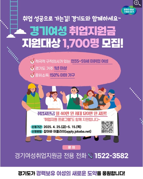 - 지원대상 : 공고일(4월 25일) 기준 경기도 1년 이상 거주한 35세~59세 미취업 여성(기준 중위소득 150% 이하 가구)